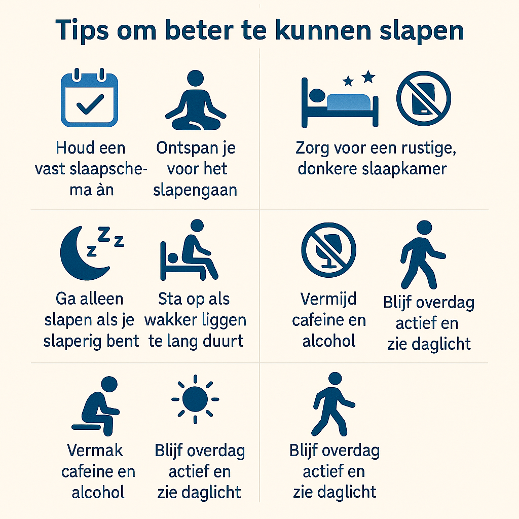 Slaaphygiëne omvat alles wat met gezond slaapgedrag te maken heeft: regelmatig slapen, je bed enkel voor rust gebruiken, en je dag- en nachtritme consistent houden. Hierover lees je meer op de pagina beter leren slapen.