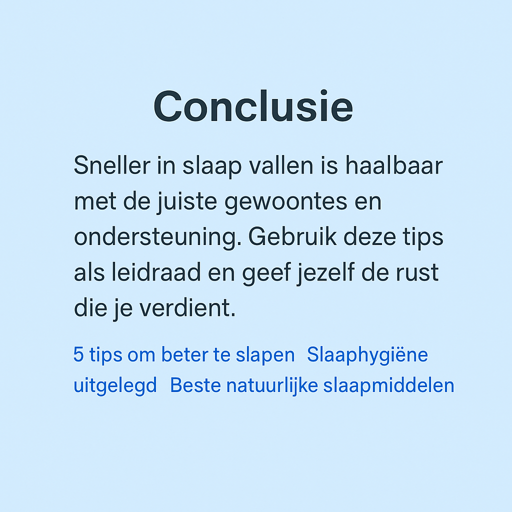 Snel in slaap vallen is geen kwestie van geluk. Het vraagt om inzicht, gewoontes en consistentie. Door goed naar je lichaam te luisteren en gebruik te maken van ontspanning, ademhaling, ritme en eventueel ondersteuning via natuurlijke middelen of advies, verbeter je je nachtrust op lange termijn.