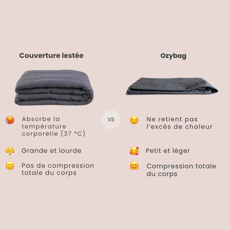 De Ozybag biedt vele voordelen ten opzichte van jouw verzwaringsdeken. Zo zorgt de Ozybag voor constante compressie op jouw gehele lichaam, terwijl een verzwaringsdeken dit alleen doet op de plekken die in contact zijn met het deken. Daarnaast houdt de Ozybag geen overbodige warmte vast en neem je hem gemakkelijk mee op reis.